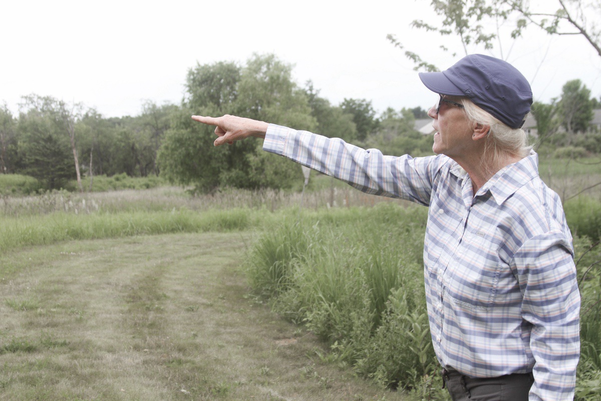 Sun City resident Amy Sanecki points to a feature at the Del Webb Sedge Meadow and Grove Nature Preserve. (Photo by Steve Peterson/My Huntley News)
