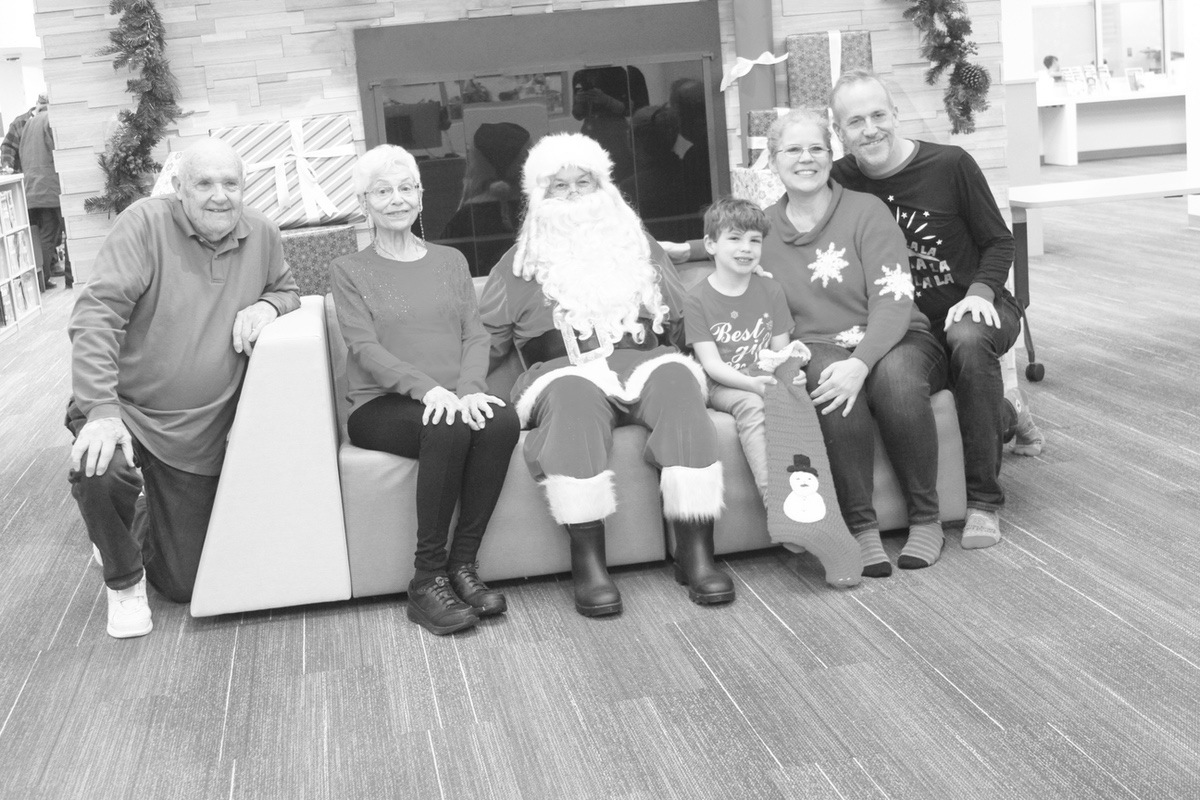 Sun City resident Jack Barrett and his family enjoyed chatting with Santa Claus at the Huntley Area Public Library’s “Photos with Santa” day Dec. 4. From left: Jack Barrett, Bonnie Barrett, Santa Claus, Evers Barrett, Susan Barrett and Mike Barrett. (Photo by Steve Peterson/My Sun Day News)