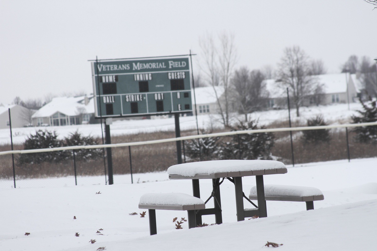 Winter has settled in at the Sun City Memorial Field off Sun City Blvd. Snow and ice cover the softball diamond, thanks to a Thanksgiving weekend storm. But come April, practices will resume followed by softball season fun. (Photo by Steve Peterson/My Sun Day News)
